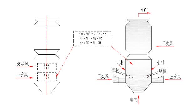本技术采用分解炉高强还原燃烧控制技术和窑头窑尾用煤量优化控制技术,使煤粉在分解炉内全部分解,形成大量的CO、H2、HCN和固定碳等还原剂,将窑内产生的热力型NOx强力还原成N2。从而大幅度减少窑尾烟气的NOx含量