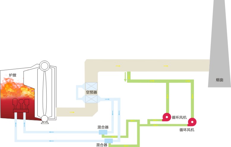燃气锅炉低氮燃烧(烟气再循环FGR)技术,从锅炉尾部烟道抽取一部分低温烟气(主要成分N2,O2和CO2)返回炉内,参与辅助燃烧和流场整合。其核心在于利用烟气所具有的低温低氧特点,将部分烟气与燃烧空气混合喷入炉膛,降低炉膛内燃烧区局部温度以及形成局部还原性气氛,从而抑制NOx的生成。