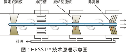 HESST TM 技术是一种高性能旋流式分离技术,用于航空航天精细分离领域,针对湿度较高的PM2.5及以下细微颗粒进行分离,保证设备运行所需的洁净环境。主要通过多级旋流技术将含尘含湿空气进行过滤,将此技术运用在燃煤电厂的尾部烟气的超净处理过程中,可将燃煤电厂的烟气处粉尘排放控制在5mg/Nm3 以下,达到超净排放的环保标准。